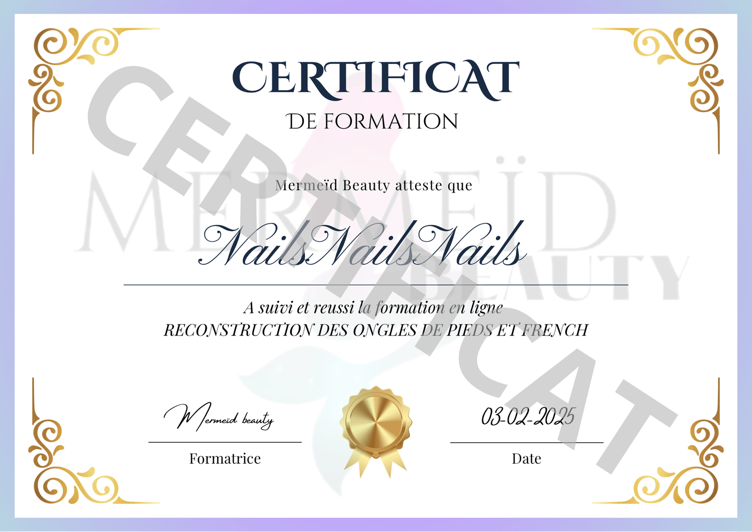 Vous recevrez l’attestation de fin de parcours mais pour le certificat de formation Mermeïd Beauty Académie envoyer vos 2 photos par e-mail formations@mermeidbeauty-ac.com ou par whatsapp au +596 0696 662 702